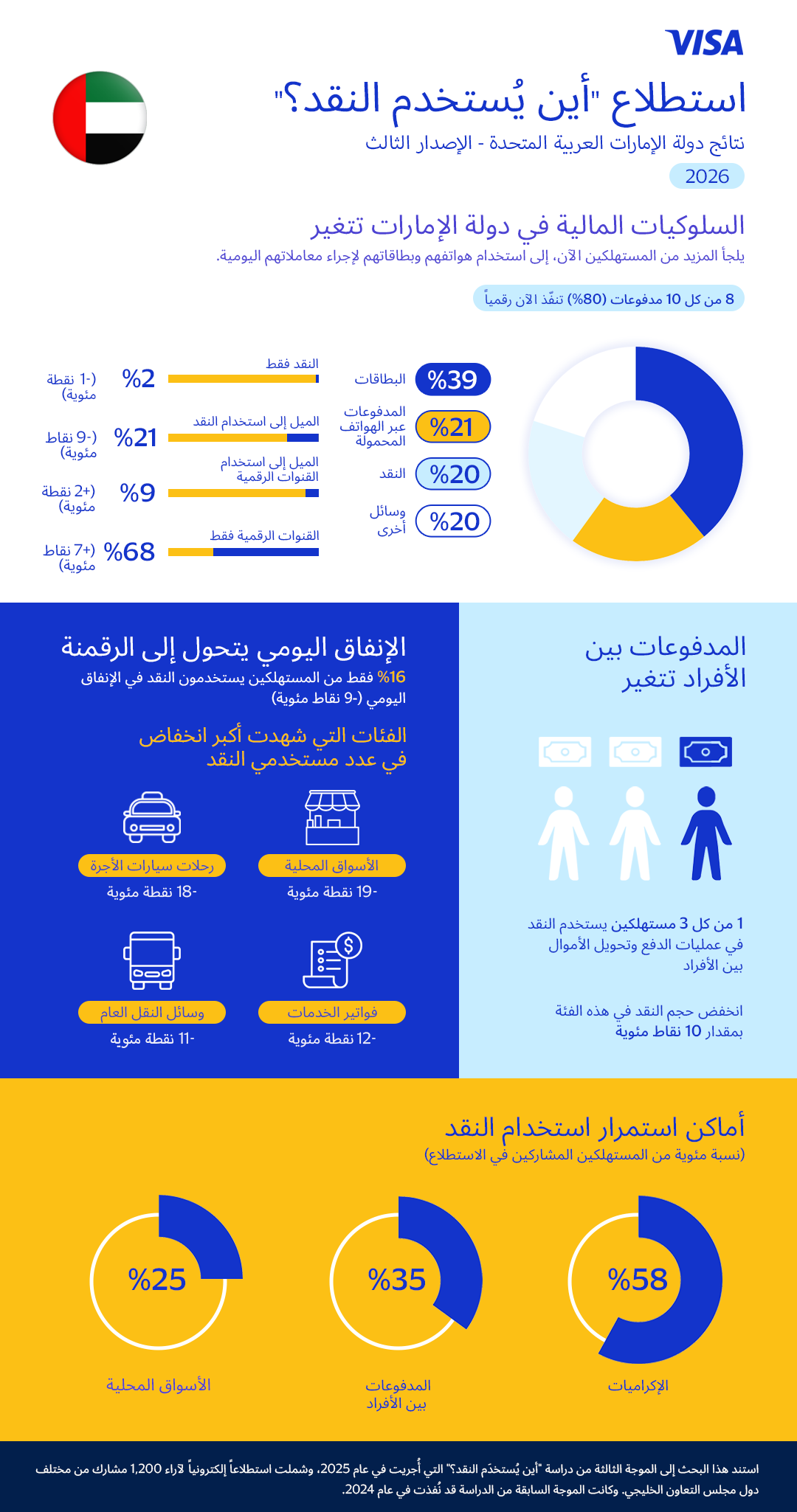 دبي، الإمارات العربية المتحدة، 14 يناير 2026: تواصل عادات الدفع في دولة الإمارات تطوّرها بوتيرة متسارعة مع إقبال متزايد من المستهلكين على التجارب الرقمية الأسرع والأكثر أماناً. ويُظهر الإصدار الثالث من تقرير Visa "أين يُستخدم النقد؟"1 أنّ 68% من المستهلكين في الإماراتيعتمدون على وسائل الدفع الرقمية، أي أنهم ينفّذون معظم مدفوعاتهم باستخدام البطاقات أو الهاتف المحمول. ويشكّل ذلك زيادة ملحوظة تبلغ 7 نقاط مئوية مقارنة بالعام السابق، ما يعكس توجهاً واضحاً نحو تقليل الاعتماد على النقد.